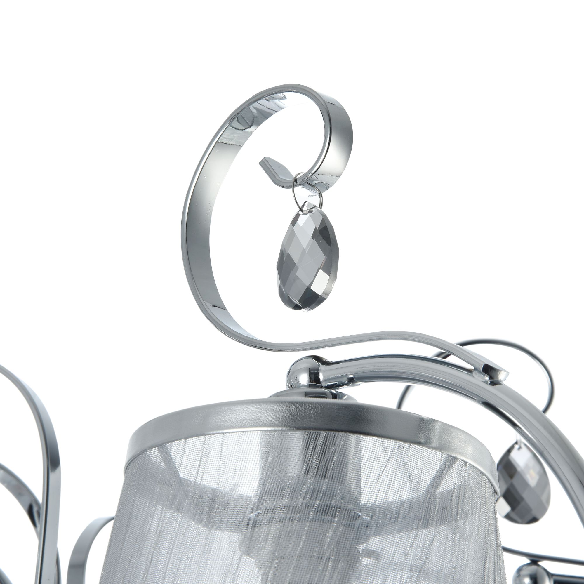 Абажуры и арматура светильников выполнены в разных цветах, с несколькими видами арматуры. Основание люстры украшено стеклянным декоративным элементом, а завитки рожков украшают подвески.